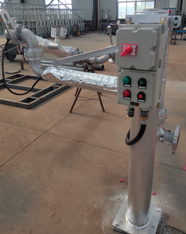 根據(jù)業(yè)主要求,乙二胺需在定溫60℃下方可進行裝卸作業(yè)。我公司電氣專業(yè)工程師成功設(shè)計出電溫控設(shè)施,可在鶴管管線加熱至60℃后經(jīng)熱傳感器信號輸出后停止加熱,在鶴管管線溫度低于60℃自動重啟加熱設(shè)備。該設(shè)備操作簡單,安全穩(wěn)定性高,一次性設(shè)定即可,能有效防范因操作不當造成裝卸不暢及設(shè)備使用壽命短的問題。