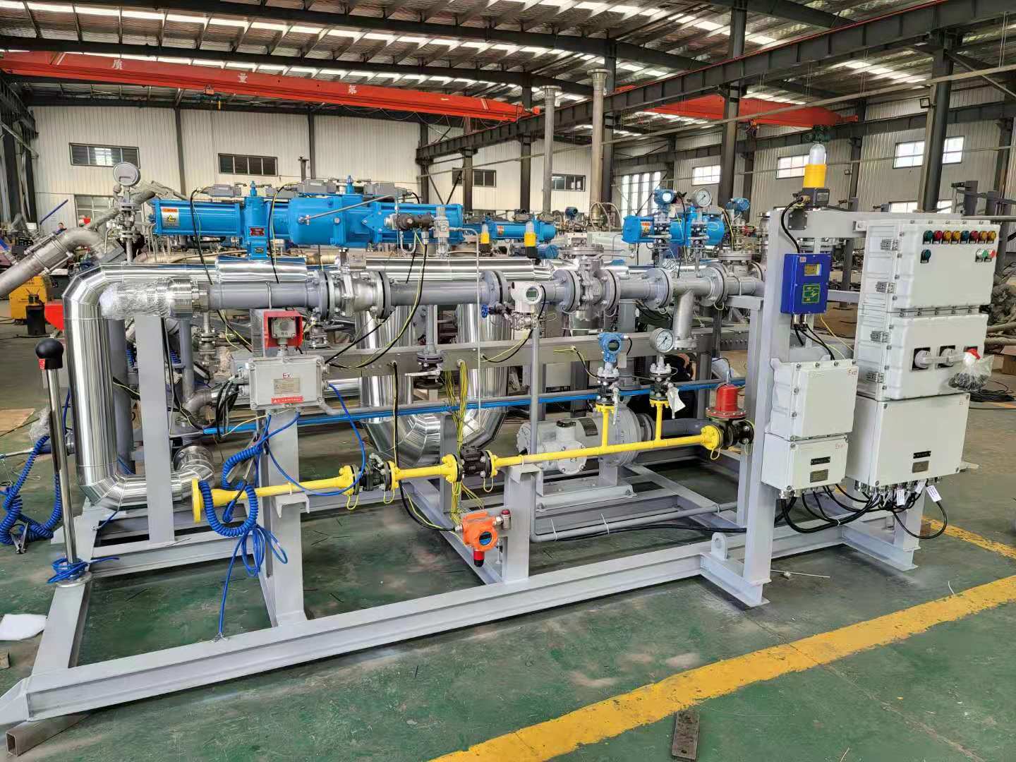 油品及化工品定量裝車橇裝組是指將每一個(gè)裝車鶴位內(nèi)的儀表和設(shè)備集成在一個(gè)專用的框架結(jié)構(gòu)內(nèi),儀表和設(shè)備包括裝車鶴管、流量計(jì)、防溢油靜電報(bào)警控制器、壓力變送器、裝車流量控制閥、緊急切斷閥,裝車泵、批量控制器等, 只預(yù)留工藝連接口和控制電源和通訊接口,這個(gè)整體集成部分稱為裝車橇。與傳統(tǒng)的裝車控制系統(tǒng)就地組裝比較,裝車橇可以節(jié)省現(xiàn)場(chǎng)設(shè)計(jì)和現(xiàn)場(chǎng)施工量,縮短項(xiàng)目工期,提高裝車控制系統(tǒng)的質(zhì)量。以下是近期公司定量裝車撬的生產(chǎn)及發(fā)貨現(xiàn)場(chǎng)。