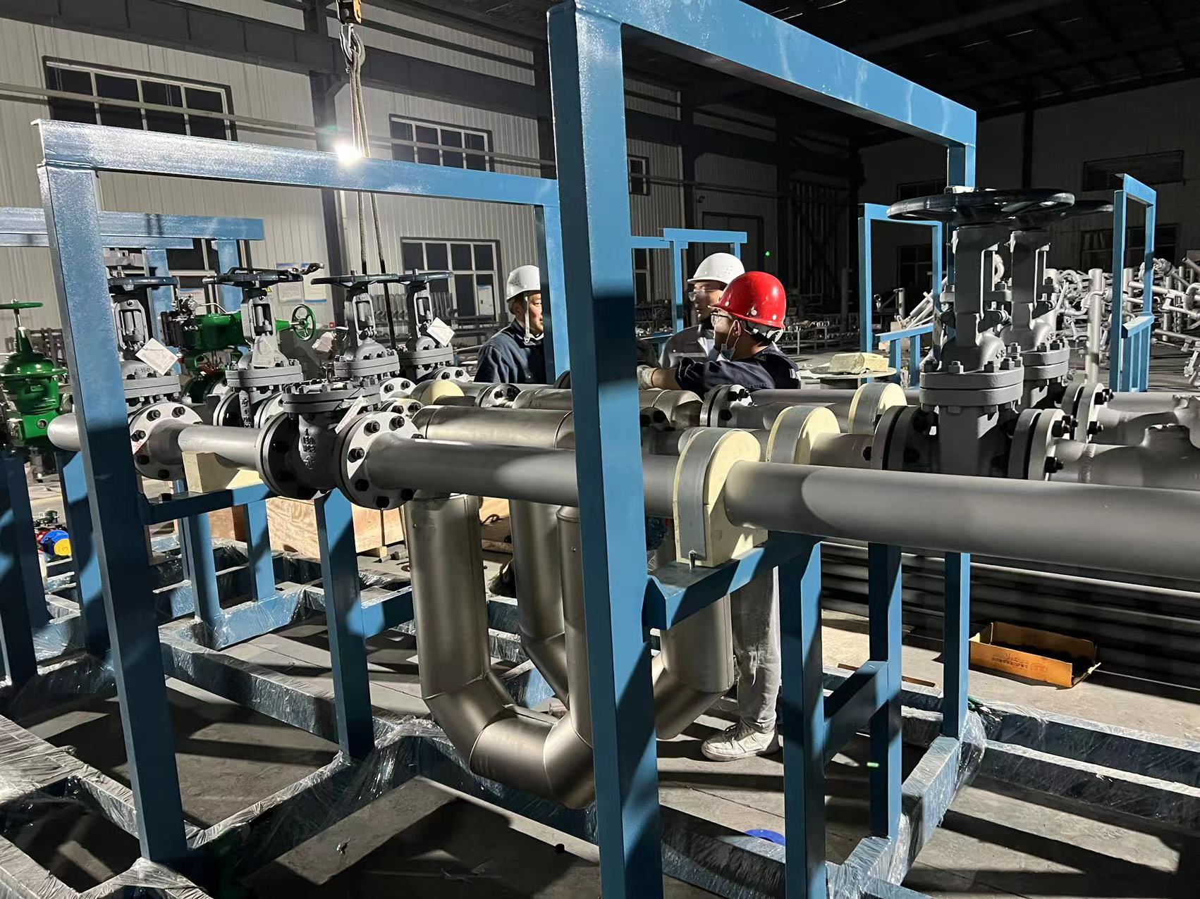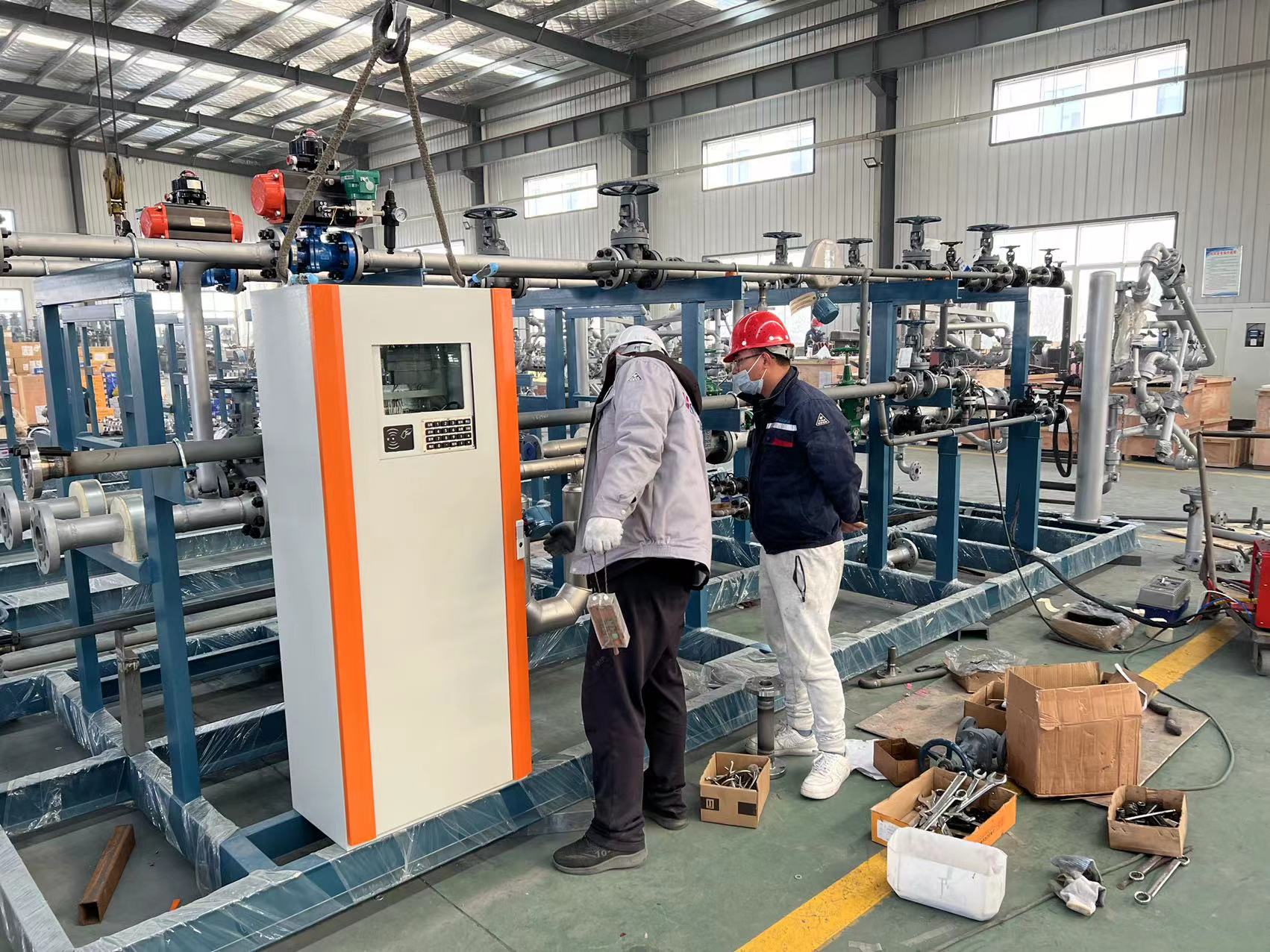 液化烴類介質(zhì)槽車裝車系統(tǒng)比油品槽車裝車系統(tǒng)復(fù)雜,現(xiàn)場(chǎng)組配裝車系統(tǒng),安裝和調(diào)試周期長,質(zhì)量不穩(wěn)定。為克服以上缺點(diǎn),在工廠內(nèi),將裝車系統(tǒng)的儀表和設(shè)備集成在一個(gè)橇裝架上,并完成電氣安裝、強(qiáng)度試驗(yàn)和低溫測(cè)試等,裝車橇到達(dá)用戶裝車現(xiàn)場(chǎng)后,接地角螺栓,連接工藝管線、通訊和供電線路就可以使用。結(jié)合液化烴類介質(zhì)裝車橇技術(shù)特點(diǎn),對(duì)液化烴裝車系統(tǒng)中的設(shè)計(jì)數(shù)據(jù)、功能要求、操作方法進(jìn)行敘述,綜合國內(nèi)裝車系統(tǒng)在使用中出現(xiàn)的問題提出了解決辦法。以下為公司近期液化烴類裝車撬的生產(chǎn)現(xiàn)場(chǎng)。